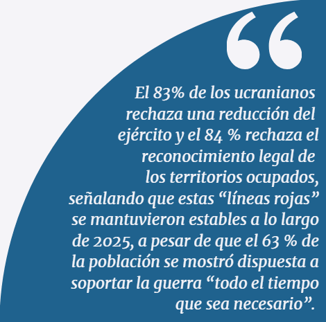 Las líneas rojas de Ucrania también reflejan limitaciones de legitimidad interna que a menudo se subestiman en los debates externos. Las encuestas de opinión pública realizadas a lo largo de 2024-2025 indican un consenso social estable en torno a los requisitos mínimos de seguridad para cualquier resultado negociado. Las encuestas muestran que la mayoría de los ucranianos rechazan los acuerdos de paz que supongan una reducción significativa de la capacidad de defensa, la aceptación de garantías de seguridad no concretas o el reconocimiento de facto de pérdidas territoriales. Es importante destacar que este consenso persiste incluso cuando aumenta la fatiga de la guerra y crece el apoyo a las negociaciones en principio[4].