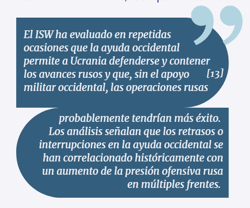 [13] ISW has repeatedly assessed that Western aid enables Ukraine to defend and contain Russian advances and that without Western military support Russian operations would likely achieve more success. For example, analyses note that delays or stoppages in Western aid have historically correlated with increased Russian offensive pressure across multiple axes. “Russian Offensive Campaign Assessment, February 18, 2024,” Institute for the Study of War, February 18, 2024. https://understandingwar.org/research/russia-ukraine/russian-offensive-campaign-assessment_18-8/
