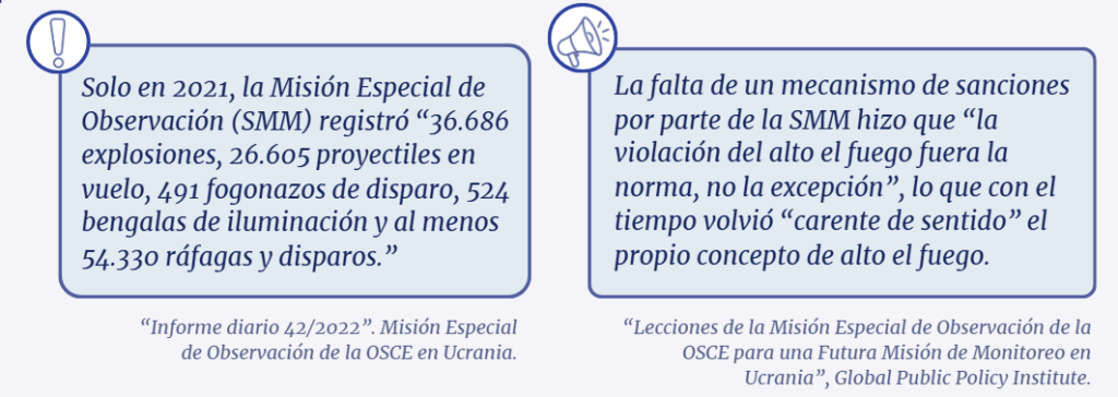 [17] In 2021 alone, the SMM observed “36,686 explosions, 26,605 projectiles in flight, 491 muzzle flashes, 524 illumination flares, and at least 54,330 bursts and shots.” “Daily Report 42/2022”. OSCE Special Monitoring Mission to Ukraine. 23 February 2022. Retrieved 16 June 2022. https://www.osce.org/sites/default/files/2022-02-23%20Daily%20Report_ENG.pdf; The SMM’s lack of sanctions mechanism meant that “ceasefire violation was the norm, not the exception,” rendering the very concept of a ceasefire “meaningless” over time. “Lessons from the OSCE Special Monitoring Mission for a Future Monitoring Mission in Ukraine,” Global Public Policy Institute (GPPi), April 2025, https://gppi.net/assets/Presence-without-Power_Lessons-from-the-OSCE-SMM.pdf