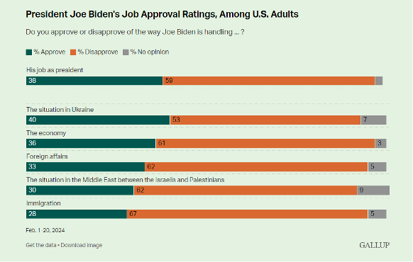 Darüber hinaus verzeichnet Biden niedrige Zustimmungswerte für die Behandlung von fünf Schlüsselfragen, mit denen die Vereinigten Staaten konfrontiert sind, darunter ein neuer Tiefstand von 28 % für die Einwanderung und Werte zwischen 30 % und 40 % für die Situation im Nahen Osten zwischen Israel und der Hamas, die Außenpolitik, die Wirtschaft und die Situation in der Ukraine.