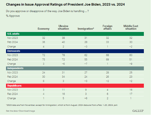 Die Zustimmung zur Wirtschaftspolitik von Biden hat sich seit November unter den Erwachsenen in den USA leicht um vier Punkte erhöht, während sich seine Bewertungen zu anderen Themen im Vergleich zu früheren Werten im November (und August für die Einwanderung) nicht wesentlich verändert haben. Während des Umfragezeitraums von Gallup vom 1. bis 20. Februar gab es weiterhin positive Wirtschaftsnachrichten aus den Vereinigten Staaten, darunter eine niedrige Arbeitslosigkeit, eine niedrige Inflation und Rekordwerte an der Börse.